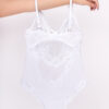 Body de tule que trabalha o bico de renda como acabamento. No busto, uma transparência linda e um detalhe de strappy – elástico – que valoriza o colo. As alças são mais largas e modeladas com o bico da renda. Esse modelo não possui aro, mas com a estrutura da modelagem, pode ter certeza que tudo ficará no lugar. Trabalhamos com cavas mais altas, uma tendência que valoriza a cintura e alonga as pernas. No bumbum, conta com um semi fio muito confortável, dando um charme extra. Para melhor vestir, possui abertura nas costas e no fundilho.
