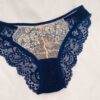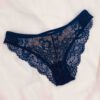 Calcinha modelo biquíni, com o uso de renda. Possui vazado nas laterais da frente da peça.